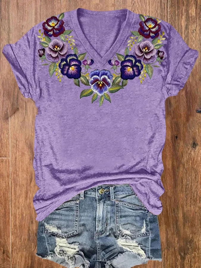 Women's Alzheimer's Purple Floral V-Neck T-Shirt